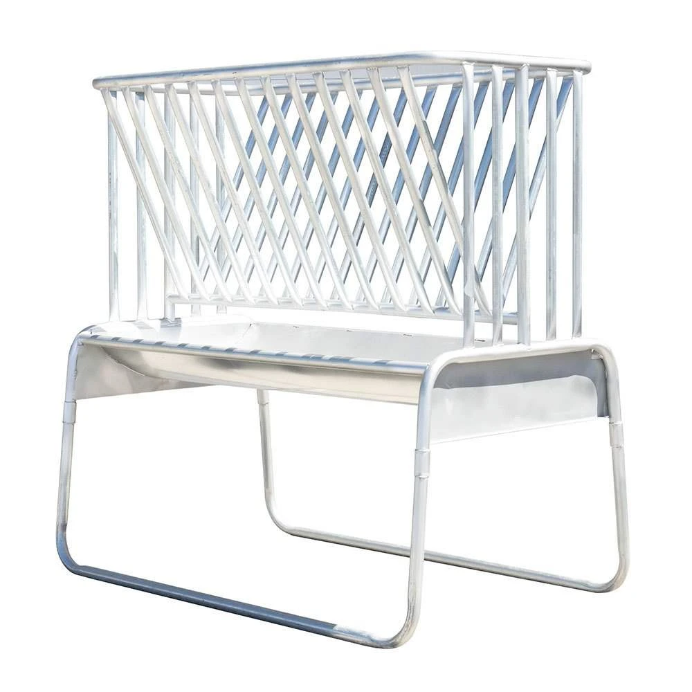 This Pasture Feeder with Hay Rack is ideal for feeding horses in pastures or paddocks. The hay rack sits over a durable bunk with a 9.5″ depth, making it ideal for feeding hay and grain. The galvanized construction guarantees your investment will last many years without rusting. This feeder is light enough to easily move, while retaining strength and stability.